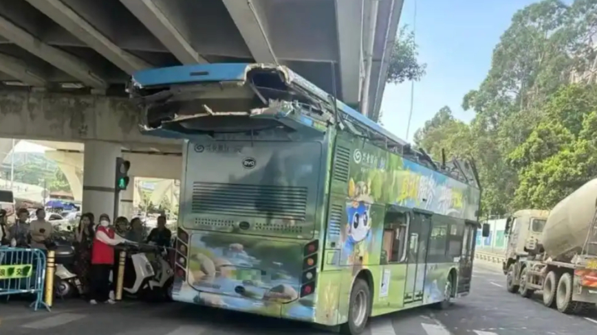 深圳双层巴士高桥下遭“剃头”事件,引起关注。有网友表示:“可能开单层开惯了,这次换双层,直接转入桥底,结果撞限高杆了。”