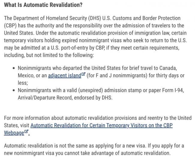 官方同时强调,AVR政策与重新申请签证不同。若申请人在境外递交新的非移民签证申请,便不能适用此政策。更多详情可参阅CBP官网“Automatic Revalidation for Certain Temporary Visitors”专页。