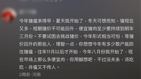 有养猪户在社交媒体贴文,暗示市场上出售的超低价猪肉很可能是病死猪:“今年猪瘟来得早,夏天就开始了,冬天可想而知,猪现在又多,短期猪价不可能回升,便宜猪肉至少要持续到明年3月份。不要试图去挑战猪价,今年形式相当可怕,等猪价回升的那些人,理智一点,你想想今年有多少散户能防住猪瘟,往年11月以后才开始,今年8月份就开始了,现在市场上那么多便宜肉,你用脚想吧,不过没关系,该吃吃,非瘟又不传人。”