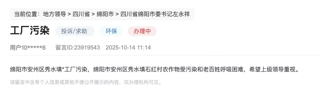 2、10月15日,ID“23927852”给四川省委书记王晓晖留言:“朝*磷肥厂污染我们的农作物和我们老百姓的身体,几个月了越来越严重,到现在还没给老百姓一个处理方案,他们又在开始生产了2025年8月13号,农作物大面积受伤害,直到10月9号早上老百姓呼吸磷肥化工厂的气体,又一次出现烟雾刺鼻,10月10号早上竹林树木叶子全落,希望领导重视。”