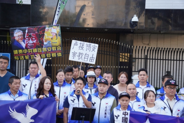 2025年10月26日,华人在中共驻洛杉矶总领馆前集会,谴责中共镇压锡安教会与法轮功等信仰群体。(主办方提供)