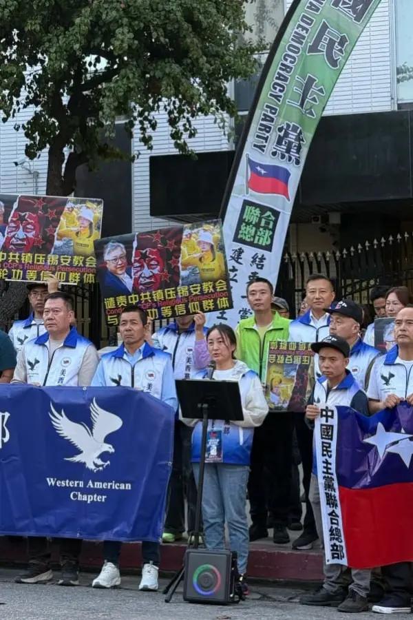 2025年10月26日,华人在中共驻洛杉矶总领馆前集会,谴责中共镇压锡安教会与法轮功等信仰群体。活动策划人之一、中国民主党全国联合总部美西党部副主席周兰英在演讲。(主办方提供)