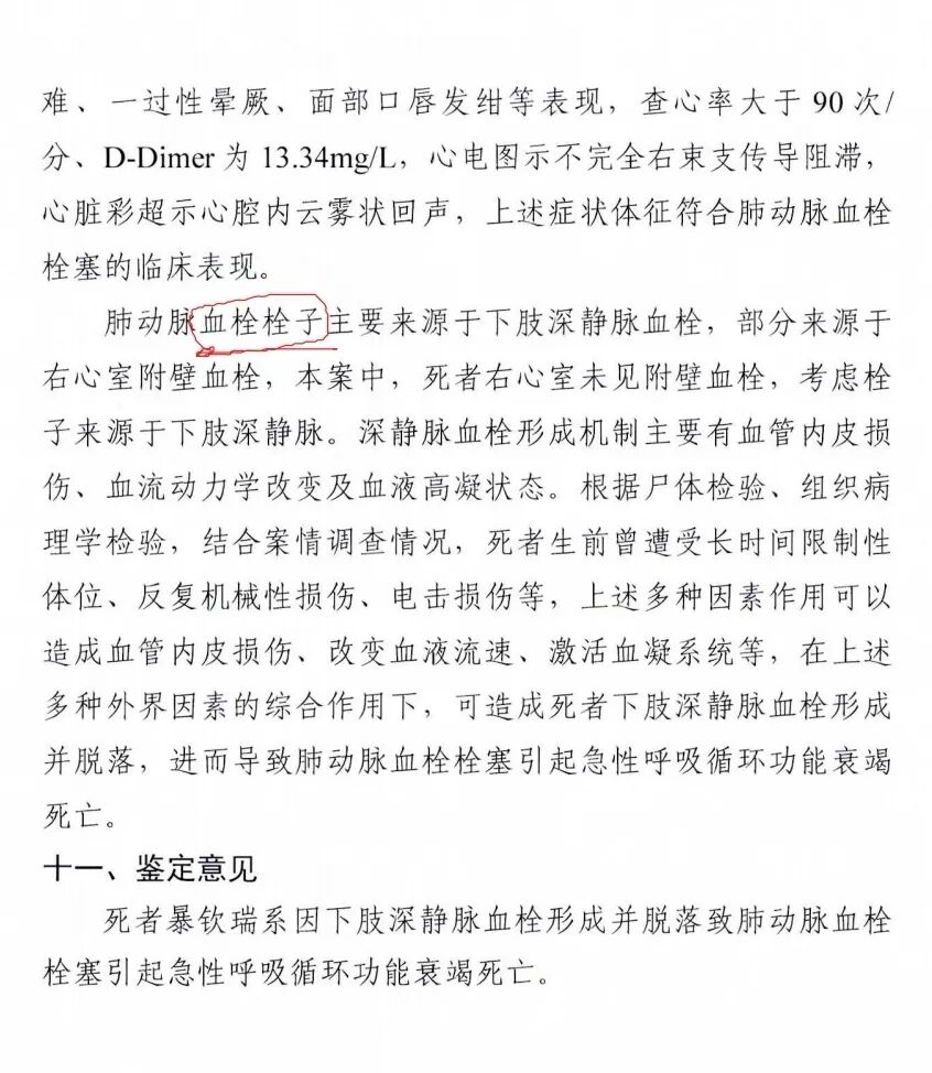 经最高人民检察院司法鉴定中心鉴定,暴钦瑞生前遭受长时间限制性体位、反复机械性损伤、电击损伤等,其下肢深静脉血栓形成并脱落,进而导致肺动脉血栓栓塞,引起急性呼吸循环功能衰竭。