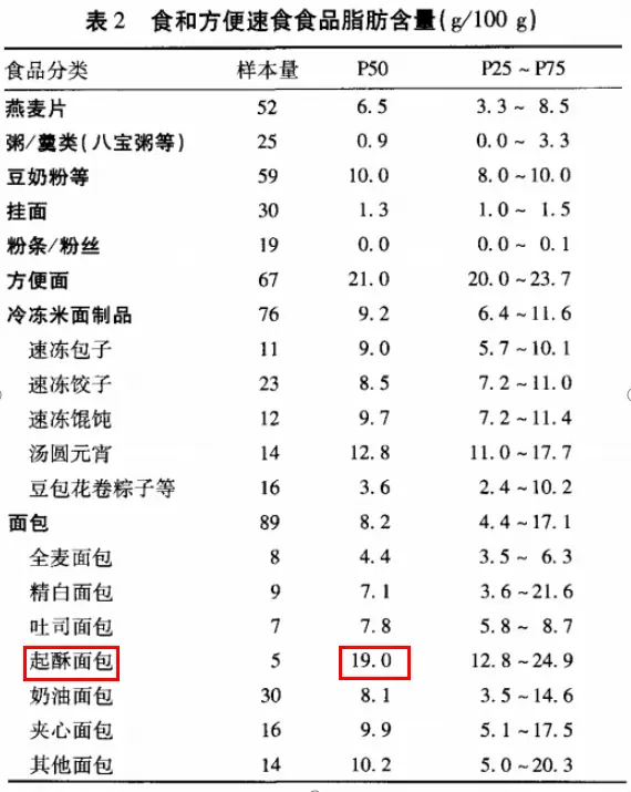 来自于中国疾控中心营养与健康所的监测评估数据提示,起酥面包以高达19g/100g的脂肪含量位居调查食材数据的前列,仅次于(油炸)方便面。