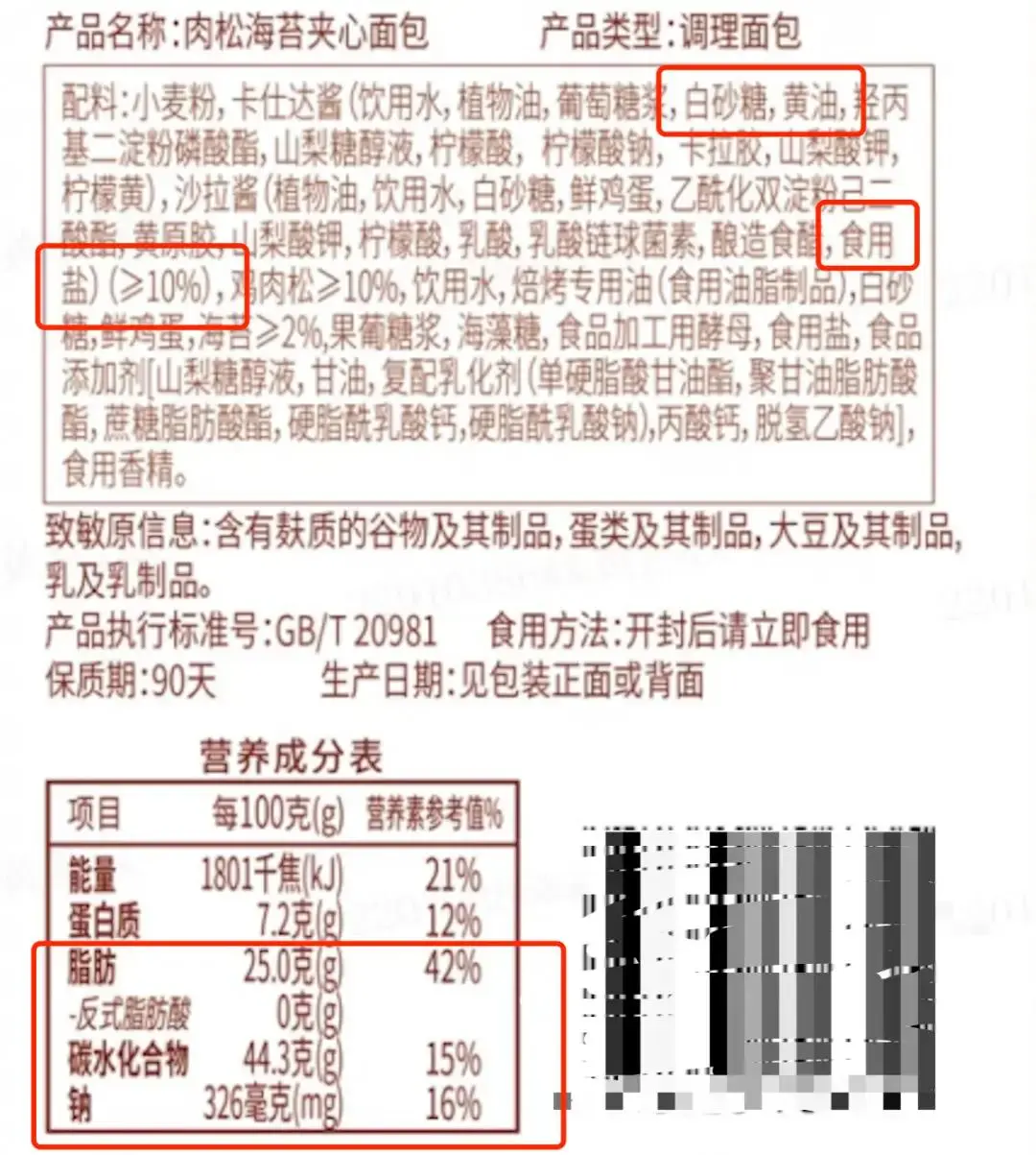 肉松本身就是超加工食品,为了增加粘附性,还要在面包表面和夹层涂抹富含饱和脂肪酸的奶油酱料。