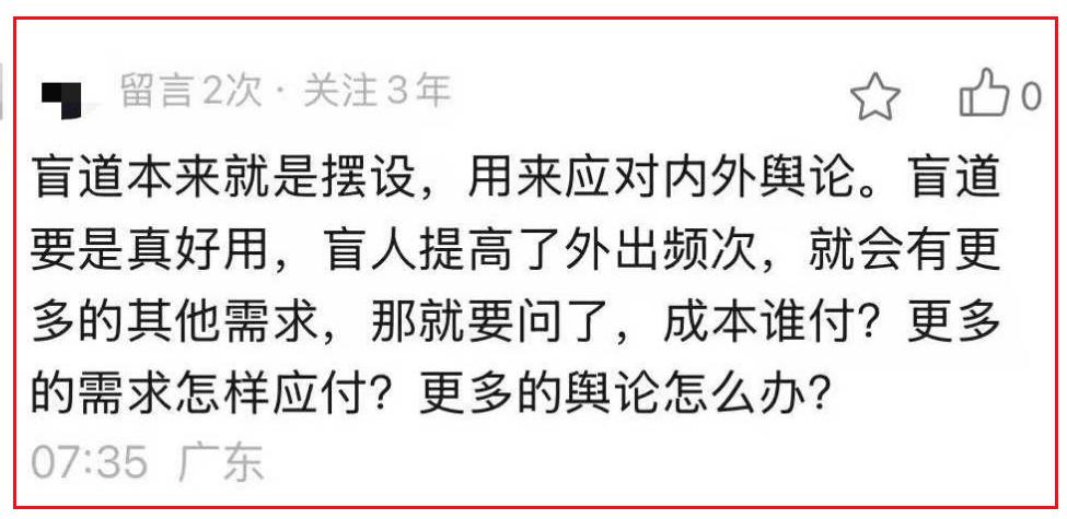 发这条评论的人,后台显示关注了我三年,昨天是他第一次留言,留了两次,都是针对“盲道”这个问题发表的评论,内容都差不多。