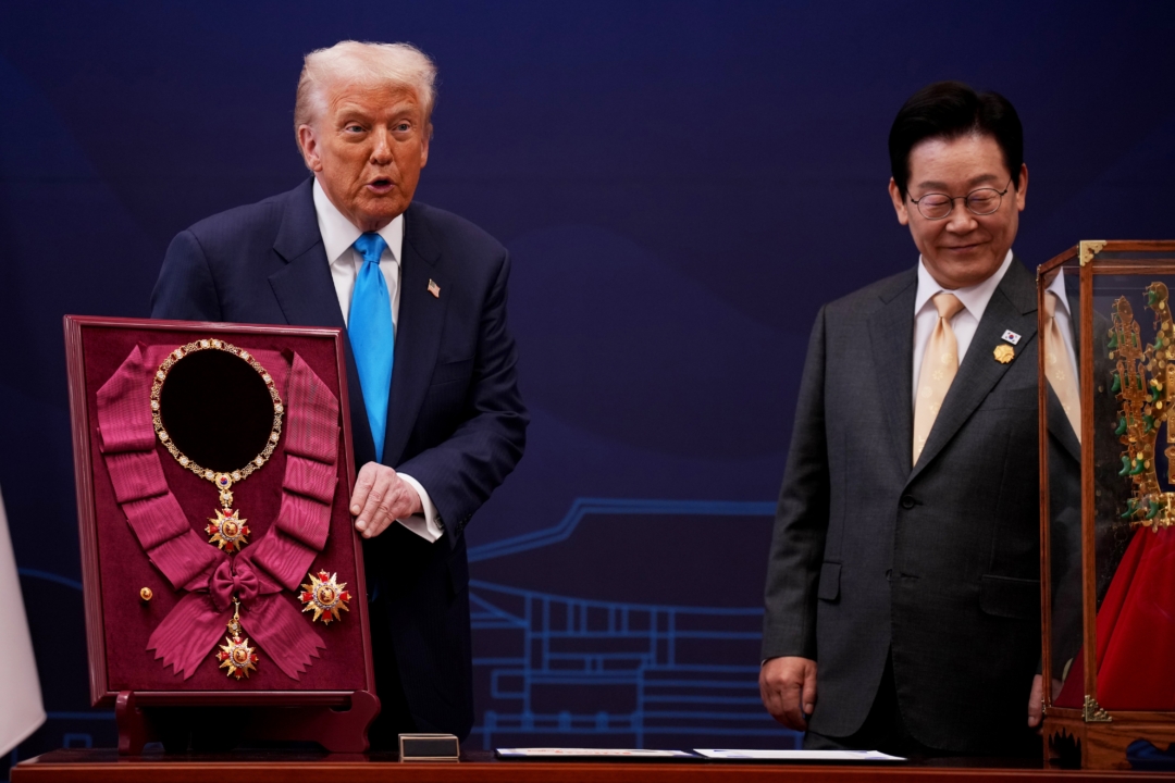 2025年10月29日,美国总统川普在韩国庆州国立博物馆,获韩国总统李在明颁授“无穷花勋章”及新罗天马冢金王冠复制品。