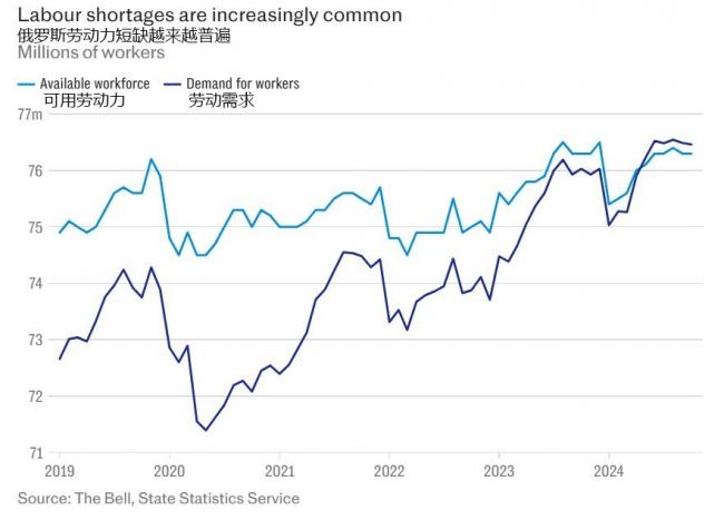 俄罗斯的人口紧缩已经扭曲了其经济,其失业率保持在 2.1% 左右的低水平,战争以来并通过工资快速增长加剧了通胀压力,但从去年底开始,日益衰退的经济导致越来越多的部门已经无法负担日益沉重的劳动力成本。