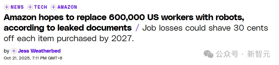 亚马逊的招聘广告正刷爆全网。25万个新岗位、经济复苏、人类与机器的共赢等等词条层出不穷。可就在同一周,一份泄露文件显示,一批AI机器人正在取代超过60万个岗位。外面是热闹的招工现场,里面是机器的冷光闪烁。在效率成为信仰的时代,连“自动化”这个词,都被悄悄改名。