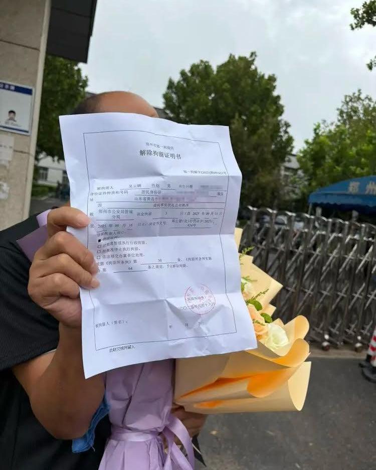 2025年9月16日,吴云鹏被释当天,在郑州市第一拘留所门口展示其收到的《解除拘留证明书》。(图_网络)