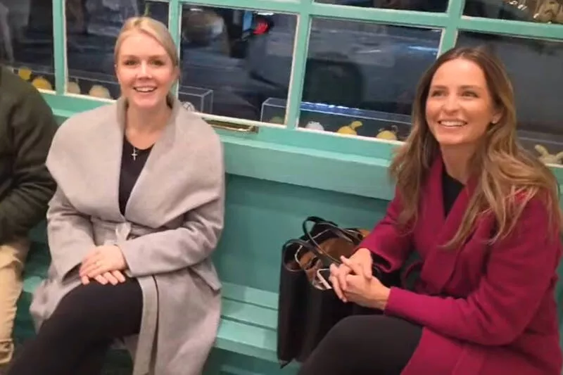 白宫新闻秘书李威特(左)与新闻联络助理马丁现身庆州冰淇淋店,亲切与YTR互动。(撷取自일롱머스크/YT)