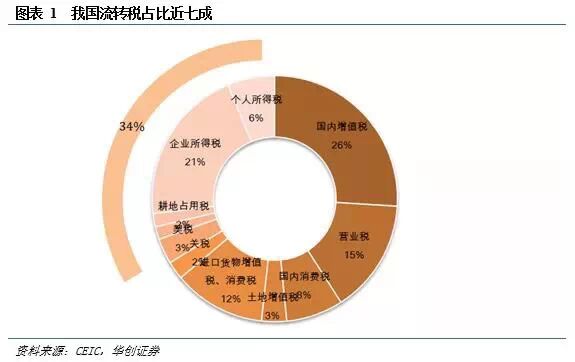 中国税制的累退特征导致其内在稳定器功能缺失。中国的税制结构以流转税为主:增值税是我国第一大税种,占比全部税收超过30%,其次是营业税,占比为16%左右,再加上消费税、关税等其他税种,流转税占比全部税收66%左右(图表1)。流转税具有累退属性,再加上我国税制设计没有采用综合所得制,自然难以起到经济稳定器的作用,反而会放大经济的波动。