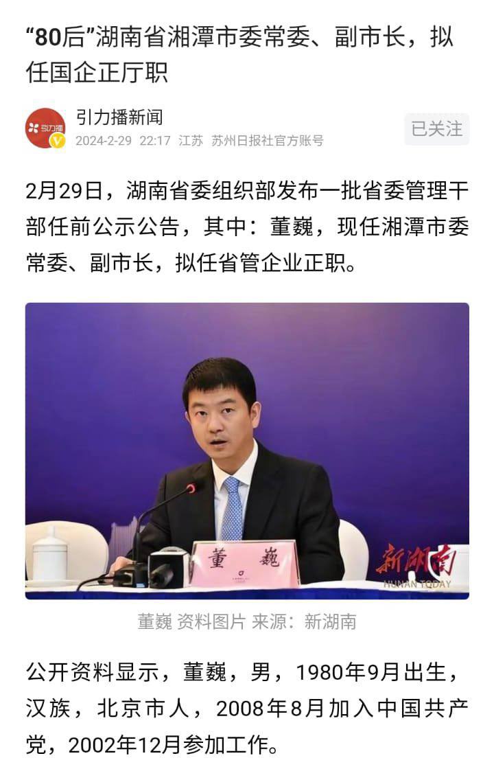 网民爆料,陈云的80后外孙董巍出任湖南湘潭市委常委兼副市长。公开履历里你完全看不出他的红三代背景。红色权贵都乔装打扮得好像都是凭自己真本事接班的。