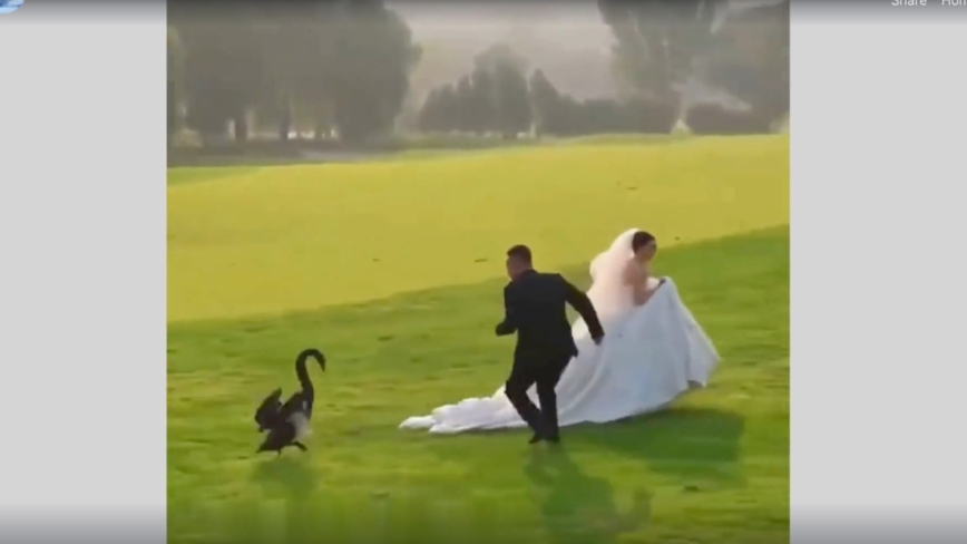 最近,山东济南一对新人在草坪拍婚纱照时,意外遇上“黑天鹅抢新娘”。(视频截图)
