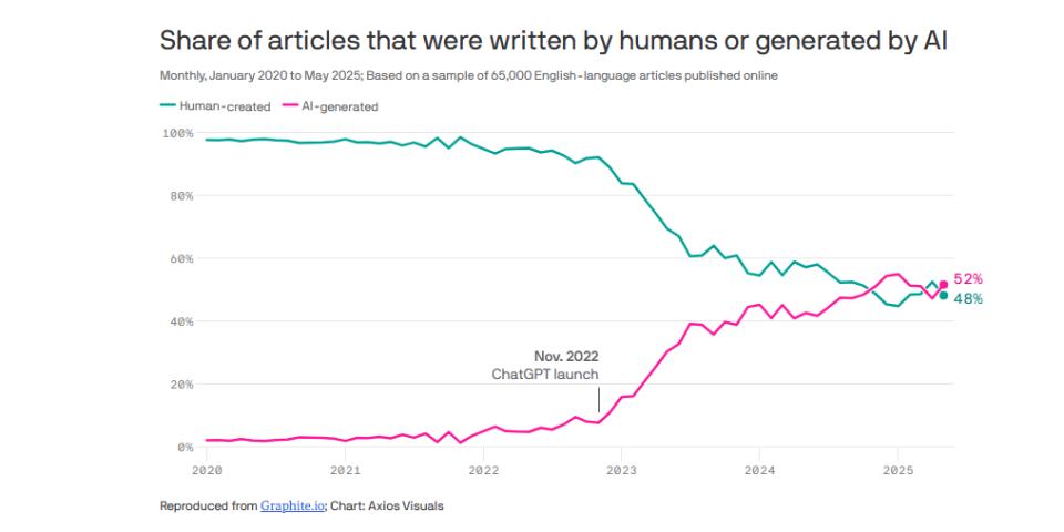 Graphite研究团队对2020年1月至2025年5月期间发布的6.5万篇英语网络文章进行分析,发现AI生成内容在2024年11月实现历史性跨越,其数量首次超越人类创作内容。截至2025年5月,这一比例已攀升至52%,意味着网络上的书面内容过半出自AI之手。