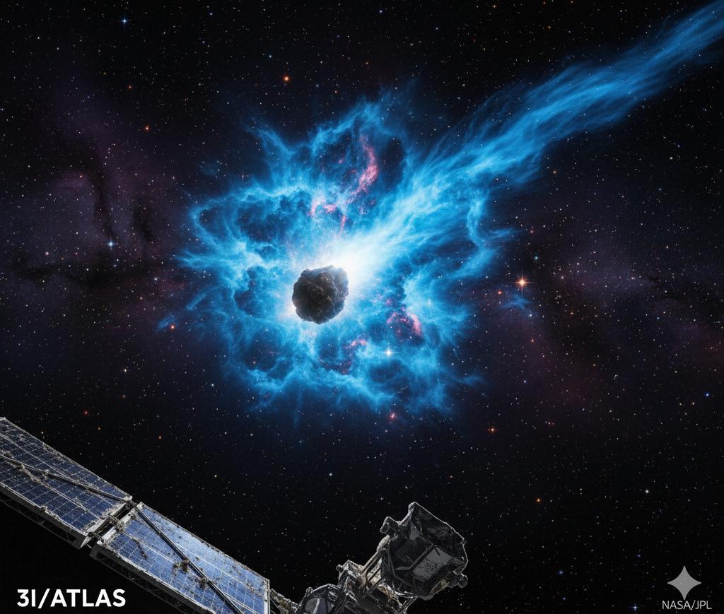 艺术概念图展现了星际彗星3I/ATLAS在通过近日点时,被NASA探测器捕捉到的极端活跃景象。这颗“系外来客”的独特行为,正挑战着科学界对彗星的既有认知。(NASA/JPL科学视觉化概念图)