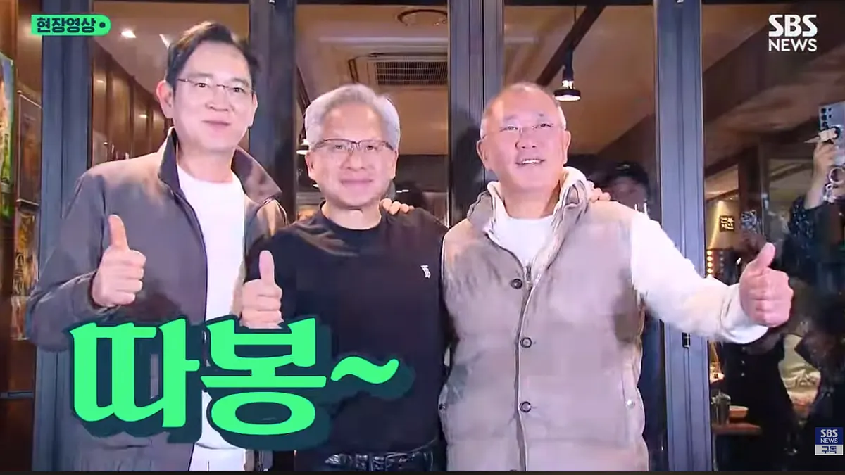 全球科技业最具影响力的其中三人,30日晚间却一同出现在首尔市区餐馆,享用炸鸡与啤酒(chimaek)的非正式聚会,这三位富豪分别是辉达(NVIDIA)执行长黄仁勋(Jensen Huang)、三星电子(Samsung Electronics)会长李在镕及现代汽车集团(Hyundai Motor)执行会长郑义宣(Chung Euisun),这也是黄仁勋近15年来第一次访问韩国。