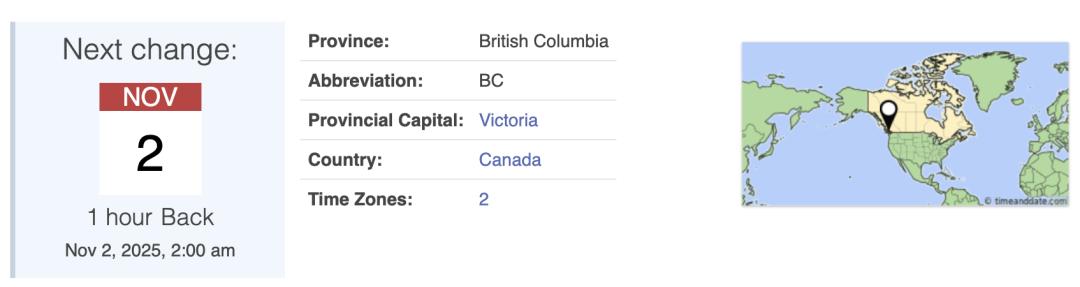又到了一年两次调时间的季节——加拿大卑诗省(BC省)的夏令时(Daylight Saving Time,DST)即将结束。当地居民终于能把春天失去的那一个小时“睡回来”。根据官方安排,今年的“调回标准时间”将在11月2日凌晨2点进行,届时时钟将往回拨一小时,当晚大家都能多睡一小时。